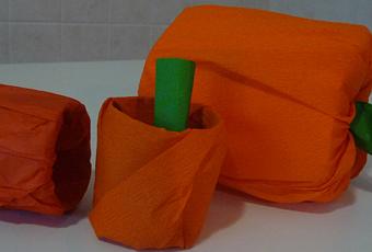 Devo trovare un qualcosa di molto veloce da realizzare, che possa andar bene anche per chi arriva all’ultimo momento, per chi ha poco tempo ma vuole lo stesso decorare una piccola parte di casa o della tavola, qualcosa che non ha bisogno di molti dettagli e di molto materiale. Potevo forse non trovare un’idea? Basterà utilizzare un rotolo di carta igienica pieno di carta (strano ma vero visto che di solito li utilizziamo vuoti) e carta velina, o crespa, arancione o verde. Ci serviranno solo 3 minuti; ci servirà più la manualità che il tempo a disposizione.