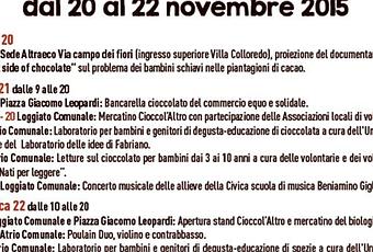 A Recanati (Mc) torna Cioccol’altro 2015, la festa del cioccolato equo e solidale organizzata dalla Bottega Mondo Solidale di Recanati, in programma dal 20 al 22 novembre. Per l’evento più dolce dell’anno stessa qualità, stessa location – Piazza G. Leopardi di Recanati – ma il doppio di appuntamenti.