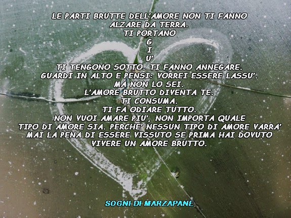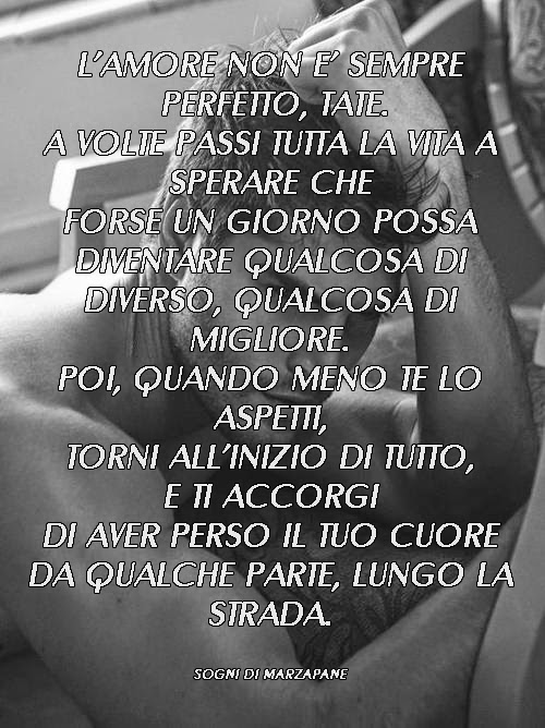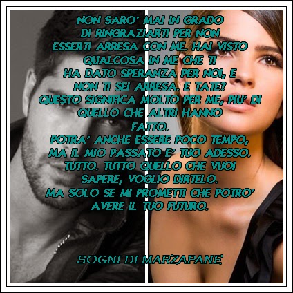 Così quando tutto torna al suo posto ed in un sera tranquilla torni a casa e trovi l’uomo che ami sul tuo pianerottolo che ti aspetta, gli apri la porta della tua vita. Anche perché ti prega di farlo entrare, visto che deve fare pipì.Ma si sa, la vita non finisce mai di stupirti, percui senza preavviso, ti ritrovi nella tua favola.Fatta di coraggio, speranza e poesia.Alla prossima.