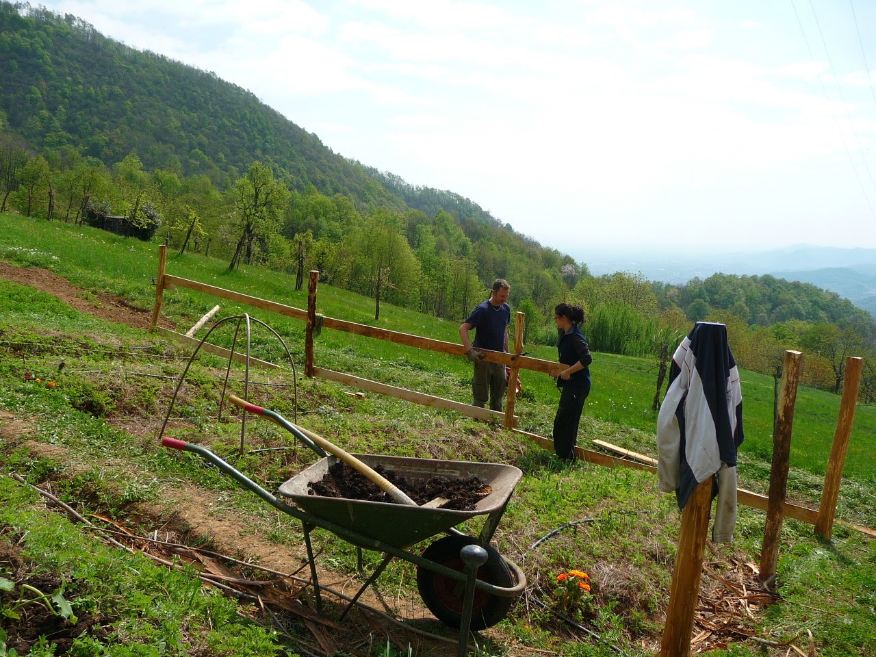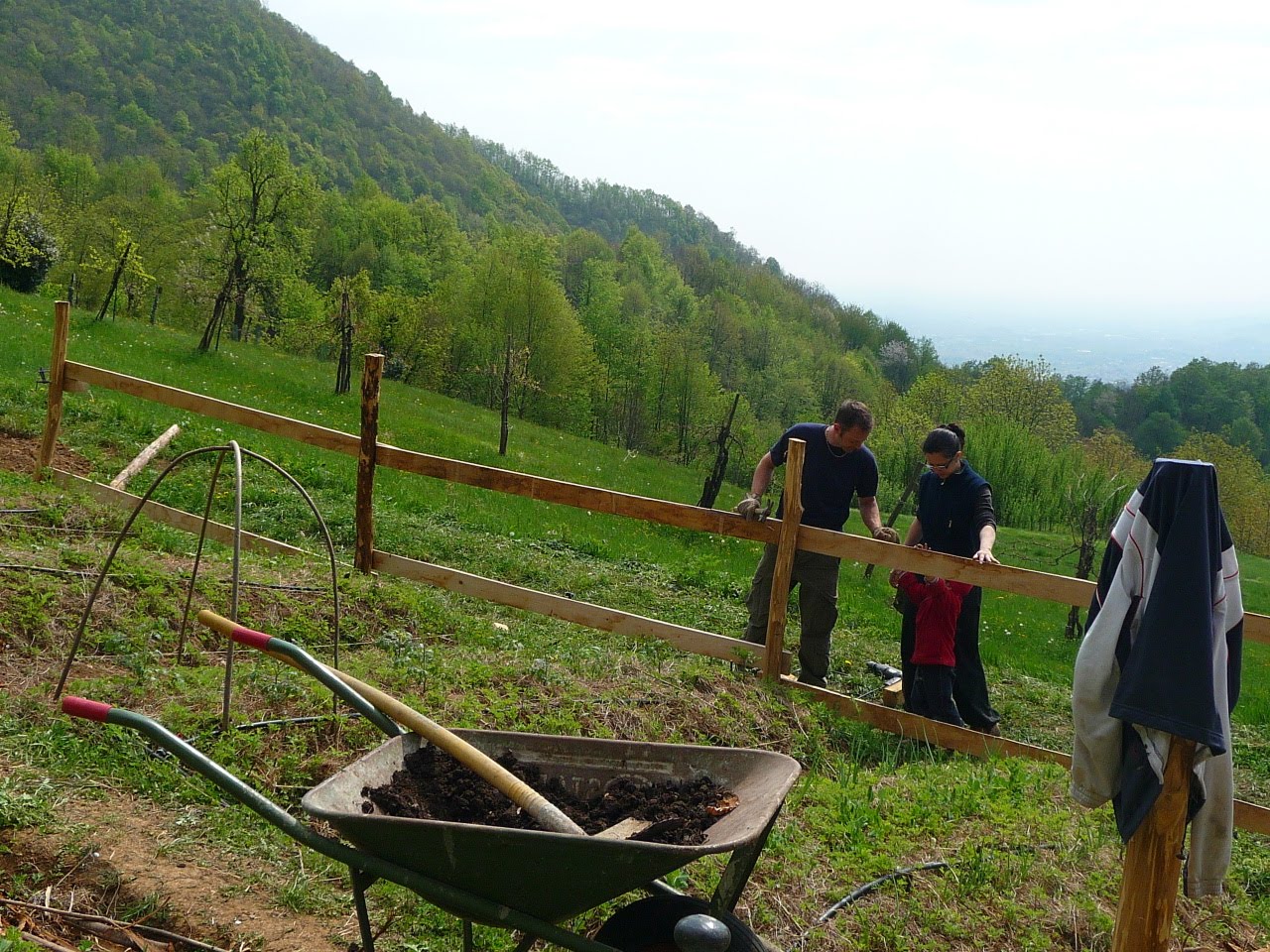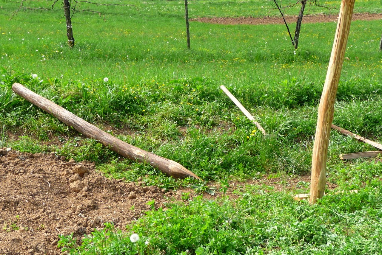 Avendo scelto di adibire questo pezzo di terra ad orto permanente non volevo una recinzione stagionale e magari in materiale sintetico (tipo rete in plastica).Anche se mi hanno detto che durante la bella stagione non corriamo troppi rischi che i caprioli ci mangino gli ortaggi perchè trovano cibo a sufficienza altrove, non abbiamo aspettato.La pulizia del bosco ci ha fornito il materiale adatto e così ecco la nostra bella staccionata.A me piace, Christian non è tanto soddisfatto (mentalità da operaio metalmeccanico specializzato in lavorazioni di precisione?).