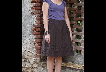 Oggi si parla di una gonna in cotone marrone con i bordi a sangallo da cui sbuca la sottogonna viola. La maglietta viola è quindi perfetta, ma trovo che all'occorrenza stia bene anche con il bianco. Il bracciale è di Giulia, ma questa volta l'ho solo preso in prestito, borsa e scarpe invece sono mie.
