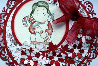 Red and White Bazzil Cardstock; Magnolia Stamp coloured with Distress Ink; Swirls Marianne Designe; Tag Magnolia; Snowflakes Whiff Of Joy; Stamp for the "phrase" Stamperia; ribbon with glitter recicled from a past presents.
