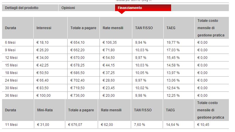 E se per caso ciò che desiderate costa troppo, non vi preoccupate, perché tutti gli articoli presenti nel sito, possono essere acquistati a rate, basterà cliccare sulla frase "DETTAGLI SUL FINANZIAMENTO" e potrete visualizzare le condizioni di acquisto rateizzabili.