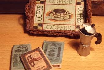 Ecco quindi le minis che io ho mandato a Meli, per il nostro swap, in cambio del suo completo a maglia : un vassoio in paglia, la caffettiera, e tre libri di favole per bambini...