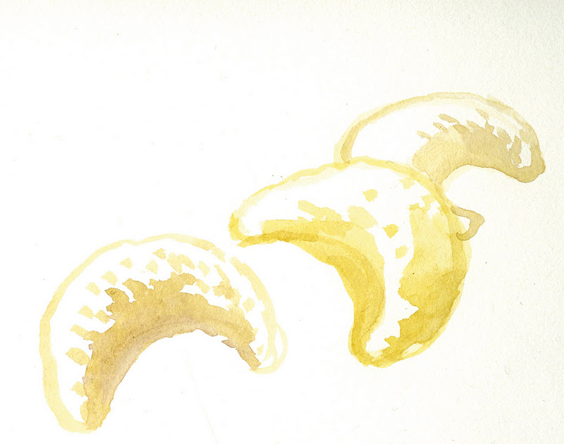 Ne viene una pastella abbastanza tenera, che disponete a cucchiaiate sulla teglia unta d'olio, distanti tra loro (attenzione che non sia così liquida da disfarsi tutta), mettere a forno abbastanza caldo (180) e preriscaldato, per circa 20', ma regolatevi a occhio che ogni forno ha la sua...Io metto arancia E cannella... vengono meno gialli che nel mio disegno... l'acquerello è acquerello ;)