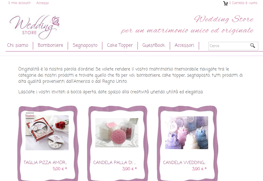 Navigare in un sito come quello di WeddingStore non significa solo fare shopping online, bensì confrontarsi, trarre spunti interessanti, ampliare la propria conoscenza riguardo tanti piccoli dettagli dei quali, magari, non siete al corrente.Denigrare il web in favore dei negozi fisici era una prassi legata alla tradizione ed al contatto umano, che mirava a sminuire l'e-commerce come se fossero qualcosa di asettico e asociale, ma in realtà, sono proprio e-shop come quello di Elisa che dimostrano quanto si possa avere un rapporto diretto ed umano con personale qualificato disposto ad ascoltare le vostre esigenze e ad avverare i vostri sogni, non solo consigliandovi gli oggetti più giusto per il vostro matrimonio d'inverno, bensì cercando di indirizzarvi verso i fornitori migliori e le soluzioni più opportune per rendere le vostre nozze davvero speciali!Potrete contattare Elisa tramite il sito o la sua pagina facebook: www.facebook.com/Wedding-Store.