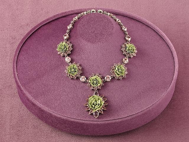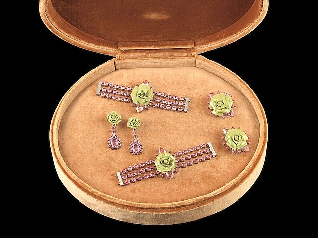 Il risultato è una gamma di proposte che gioca sull'alternanza di gemme colorate, pietre dure, tessuti e boccioli di rosa trompe-l'oeil in resina e cristalli.