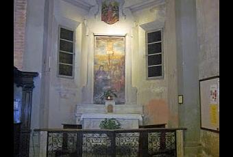 Indicata solitamente come "prima cappella di destra" vi troviamo un affresco con la Crocifissione di autore ignoto del secolo XVI. Non viene ritenuta di grande pregio, è comunque un discreto affresco, oggi danneggiato. Tutta la cappella si presenta in deplorevole stato per effetto principalmente da infiltrazioni di umidità. Vi sono parti residue di vecchie colorazioni. In miglior stato il medaglione in alto che raffigura la Madonna Assunta sempre di autore ignoto del XVI secolo.