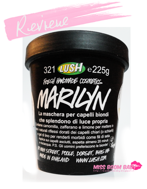 Ciao ragazze, oggi un post sulla cura dei capelli :D Vi ho anticipato che a Natale avevo ricevuto alcuni prodotti Lush ed essendomi trovata bene avevo deciso di tornae in negozio e di acquistare qualche altro prodotto, oggi vi parlerò di un prodotto che ha fatto tornare splendenti i miei capelli: la maschera Marylin. E' indicata per i capelli biondi perchè dovrebbe aiutare a mantenere brillante il colore e a donare riflessi, è un acquisto fatto in "collaborazione" con mia sorella, biondissima al naturale. Cercava una maschera che le aiutasse a disciplinare i capelli fini e che non li appesantisse, io cercavo una maschera molto nutriente ma leggera, avendo i capelli secchi ho bisogno di nutrimento profondo ma allo stesso tempo che siano leggere e che non appesantiscano le lunghezze.Caratteristiche (dal sito): Chi è la più bionda delle bionde? Quella che nel 1947 fu incoronata "Miss Carciofo"? Ovviamente è la mitica Marilyn (e la storia di Miss Carciofo è vera!). In questa maschera c'è tutto quello che sarebbe servito ai suoi famosi boccoli.Camomilla, zafferano e limone mettono in luce i naturali riflessi dorati dei capelli chiari (o schiariti), mentre il gel di lino li trasforma in fili di seta. I diamanti sono i migliori amici delle donne. Ma Marilyn è la migliore amica delle bionde che vogliono esserlo di più.Inci: mucillagine di lino (linum usitatissimum), infuso di camomilla (anthemis nobilis, chamomilla recutita), infuso di zafferano (crocus sativus), cetearyl alcohol (&) sodium lauryl sulfate, succo fresco di limone biologico (citrus limonum), cetearyl alcohol, olio extra vergine di oliva (olea europaea), olio essenziale di limone (citrus limonum), olio essenziale di camomilla (anthemis nobilis), lecitina di soia (lecithin), *citral, *limonene, profumo (parfum), methylparaben, propylparaben. * Presente naturalmente negli oli essenziali.Modo d'uso: Applicare sui capelli asciutti e lasciare agire per almeno 20 minuti prima di fare lo shampoo. Cosa ne penso: adoro questa maschera, l'adoro davvero! Non pensavo funzionasse su di me, mi sono lasciata convincere da mia sorella ed ho fatto benissimo. Ammetto di non aver mai curato i miei capelli, più che usare prodotti specifici per capelli secchi o ricci non ho mai fatto molto. Per un periodo ho fatto regolarmente impacchi con l'olio di semi di lino ma la mia incostanza mi ha fatto abbandonare questo tipo di trattamenti ben presto, nonostante notassi miglioramenti. Ho iniziato anche a eliminare pian piano i siliconi per quanto possibile dalla mia hair-routine ma non ho mai sperato che i miei capelli potessero migliorare: niente di più sbagliato! Questa maschera sui miei capelli sfribrati, stanchi e in parte decolorati funziona a meraviglia, per il primo mesetto circa l'ho usata regolarmente prima di ogni lavaggio per un trattamento d'urto pian piano ho diminuito le applicazioni ad un paio di volte al mese. I risultati si sono visti da subito, già dalla prima applicazione i capelli risultavano più docili al pettine e meno crespi, man mano che la utilizzavo i capelli apparivano più forti e lucidi, le lunghezze e le punte sempre meno secche. E' una maschera leggera che non appesantisce il capello quindi è consigliata anche a chi ha i capelli fini. Non saprei pronunciarmi sull'effettiva azione riflessante perchè ho i capelli castano scuro (e da poco tinti con l'hennè) quindi su di me funziona solo l'ossigeno per schiarirli. Il costo è di 14.10€ per 225gr può sembrare elevato ma è ben ammortizzato perchè usandola in due dura circa tre mesi e sta terminando in questi giorni, ne serve davvero poca per coprire le intere lunghezze, io ho i capelli lunghi all'altezza delle spalle, mia sorella a metà schiena. La potete acquistare in negozio o sul sito ufficiale: LUSH.IT