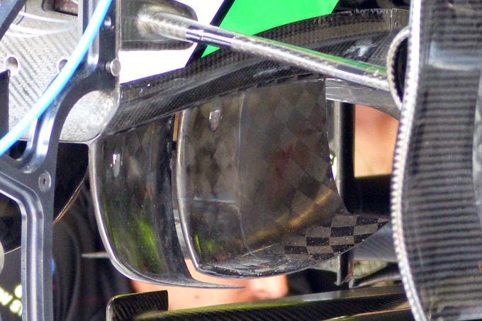 Sono stati inseriti nella zona centrale del diffusore dei piccoli generatori di vortice come fatto ad inizio stagione dalla Red Bull. I generatori di vortici servono a mantenere stazionario il flusso sul diffusore e a "rimescolare" il flusso all'interno dello strato limite con il flusso fuori dallo strato limite in modo da ri-energizzare lo strato limite. In questo modo si riescono a ritardare gli effetti di separazione del flusso(quindi lo stallo e drammatici aumenti di resistenza). I generatori di vortici in generale aumentano un po' la resistenza perché creano i vortici, ma evitano che in certe condizioni la resistenza aumenti in modo eccessivo a causa della separazione.FOTO @techF1LES