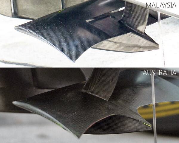 McLaren La scuderia di Woking dopo aver introdotto un nuovo muso a Sepang ha portato per la gara del Bahrein una nuova ala anteriore. Come potete vedere dal confronto in basso l'ala è stata modificata nella zona degli upper flap dove è stato introdotto un piccolo flap per indirizzare il flusso d'aria nella zona esterna degli pneumatici anteriori.