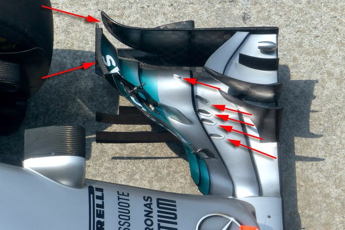 Gli ingegneri della Mercedes avevano introdotto a partire dai test del Bahrein una piccola aletta sotto il muso che ricordava molto quella utilizzata sulla Brawn Gp nel 2009. In Malesia questo piccolo profilo aerodinamico è stato modificato aggiungendo una piccola soffiatura nella parte centrale ed è stato cambiato il piloncino di fissaggio al telaio. Per ora, questa modifica, è stata confermata sulla W05 anche in Bahrein. L'obiettivo degli aerodinamici anglo-tedeschi con l'introduzione di questo deviatore di flusso è quello di migliorare l'andamento dei flussi per far lavorare al meglio l'aerodinamica intorno alla chiglia che è una delle zone nevralgiche proprio per il campo di alta pressione che si genera al crescere della velocità.Visti gli ottimi risultati avuti in Malesia è stato confermato il nuovo fondo e il nuovo estrattore che, rispetto alla precedente versione, massimizza l'estrazione d'aria aumentando il carico aerodinamico al posteriore allungando la zona di "bassa pressione. Nella zona centrale sono stati aggiunti, come potete vedere dal confronto in basso) due slot ai lati delle alette per aumentare l'estrazione d'aria. In questa zona del diffusore viene canalizzato il flusso d'aria proveniente dalle fiancate.