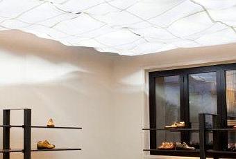L’essenza e lo stile di Fratelli Rossetti si esprimono attraverso molteplici elementi di arredo progettati per la boutique dall’architetto francese François Muracciole. All’ingresso si viene accolti da un originale pavimento in cuoio, che rievoca uno dei materiali più classici della tradizione aziendale. La pedana, che sostiene i ripiani espositivi in ferro e in vetro, si ispira al movimento delle fustelle utilizzate per tagliare a mano la pelle: tutto sotto un soffitto in carta che crea un morbido effetto nuvola.