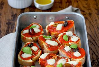 PreparazionePer prima cosa scaldate il forno a 200°C circa. Nel frattempo prendete del pane raffermo e tagliatelo a fette o a metà, a seconda delle dimensioni. Qualora il pane fosse troppo duro potete immergere velocemente ogni fetta in un po' di latte. Ponete le varie fette su una teglia. Preparate il condimento mettendo in una ciotola della passata di pomodoro, insaporitela con cipolla tritata finemente, un pizzico di sale, olio e origano. Lasciate riposare per qualche minuto. Condite quindi il pane con generose cucchiaiate di salsa. Tagliate la mozzarella a dadini e cospargetela generosamente. Aggiungete quindi i vostri ingredienti preferiti, come le olive nere e verdi, tagliate grossolanamente. Completate con un filo d'olio e qualche foglia di basilico. Infornate quindi per circa 5 minuti, tenete sotto controllo il grado di cottura. Saranno pronte non appena risulteranno ben croccanti e con la mozzarella filante.