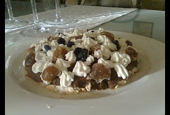 Montate 200 g di panna fresca a cui avrete aggiunto di 2 cucchiai di zucchero a velo. Per montare la panna valgono le stesse raccomandazioni che per montare gli albumi. Mischiate con un cucchiaio la metà della panna montata e tutta la meringa sbriciolata, compattate il miscuglio su un piatto da portata fino a dargli la forma di una "base-torta" di spessore 1-2 cm e diametro 20 cm.