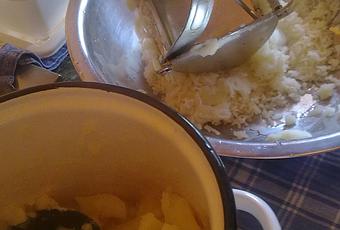 Preparazione: Sbucciamo le patate e tagliamole a pezzi (grandi) così che cuociano prima. Laviamole abbondantemente prima di tagliarle a pezzi e non più dopo (se ho capito bene lavandole troppe volte perde di più del prezioso amido o una cosa del genere). Le mettiamo in acqua abbondante in una pentola sul fuoco (a fuoco alto finché l'acqua non bolle, poi a fuoco medio-basso). Aggiungiamo una manciata di sale quando l'acqua bolle, e ognitanto giriamole. Non devono cuocere troppo, solo quanto basta (circa 20 minuti dopo il bollore). Quando le patate sono cotte e scolate, schiacciamole subito.