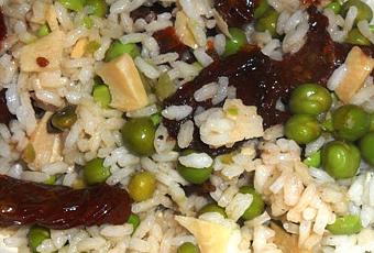 Cucina fusion o semplici ricetta con avanzi? Direi che la seconda definizione è più appropriata! Il riso con pomodori secchi, piselli e scaglie di provolone che ho preparato qualche giorno fa potrebbe essere una variante semplificata del riso alla cantonese, ma io preferisco chiamarlo semplicemente riso vegetariano con gli avanzi, per riciclare in modo gustoso e poco impegnativo quello che si ha in casa.