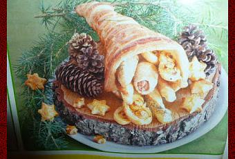 preparare dei salatini a forma di croissant ripieni di wurstel altri arrotolando strisce spennellate di pesto di pomodori secchie altre con patè di olive spennellarli e metterli in forno a 190à per 15' poi quando la cornucopia è cotta riempirla con i salatini