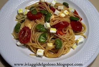 Preparazione: Mettiamo a bollire l’acqua per la pasta. Nel frattempo usando una larga padella, prepariamo il condimento mettendo l’olio e lo spicchio d’aglio, appena soffrigge uniamo i pomodorini tagliati a metà. Poi lasciamo cuocere 5 minuti circa e aggiungiamo le fave sbollentate a parte per qualche minuto. Saliamo e lasciamo insaporire il tutto alcuni minuti. Buttiamo gli spaghetti e quando saranno cotti, tenendoli un po’ al dente, li andremo a unire nella padella al condimento, spadelliamo e uniamo la feta tagliata a quadrotti servendo subito.
