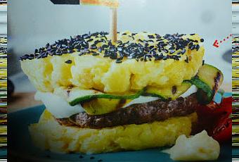 componete gli hamburger mettendo in successione i dischi senza semi come base gli hamburger la mozzarella tagliata a fette le zucchine e i dischi di patate con il sesamo