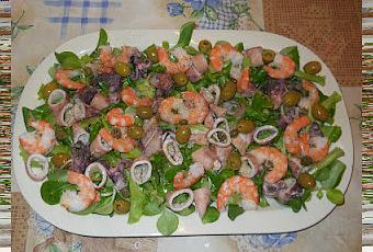 - Aggiungere i gamberi e i calamaretti lessati, sbucciati, e fatti raffreddare.