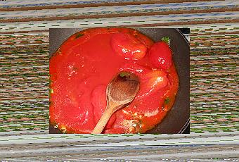 Aggiungere i pomodori pelati (in precedenza schiacciati) con il loro succo. Far cuocere per circa 5 minuti. Schiacciare i pomodori con il mestolo.
