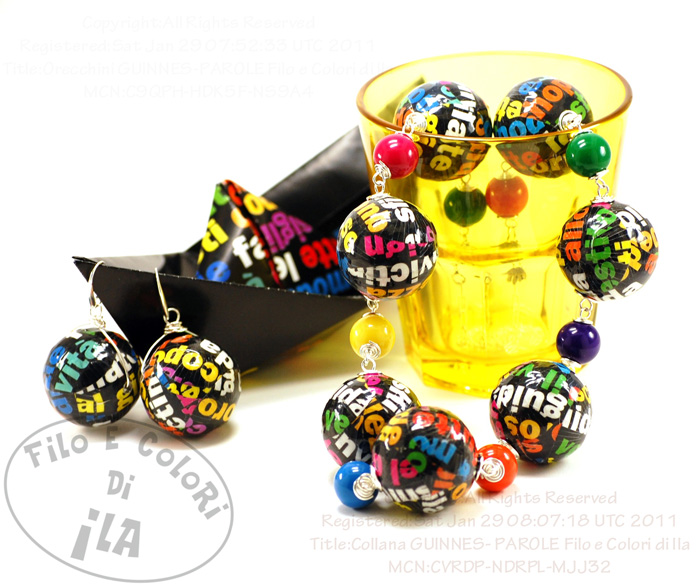 Orecchini e collana GUINNES - PAROLE!Gli orecchini, nonostante le dimensioni notevoli non sono pesanti, tanto che ho deciso di farne un paio anche per me (non riesco più a sopportare pendenti pesanti alle orecchie... che sia un problema causato dall'incipiente vecchiaia che avanza? bua ha haaaa! risata malefica)