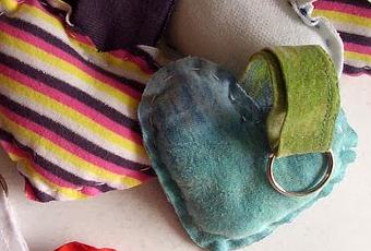 Inizio con dei porta-chiavi morbidosi, confezionati con della stoffa recuperata da vecchie T-shirt colorate. Il laccetto al quale è attaccato l'anellino di metallo è fatto con gli orli delle maniche.