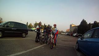 Gli altri mancano all'appello (alcuni causa impegni, altri perchè mancava la distanza ed il dislivello nelle gambe oltre forse a qualche...disperso lungo il percorso). Andrea B. a Castelcerino accusa la stanchezza e raggiunge il Pigno per la via meno impegnativa e ci aspetta mentre noi scendiamo e poi risaliamo per l'ultima fatica facendo quindi il percorso previsto. Al Pigno si può dire che che l'ultima salita è alle spalle oramai e quindi dopo poco meno di 60 km ci attendono gli ultimi 10 km scarsi. Arriviamo a Monteforte dove ciacoliamo un poco (ma dopo un pò cominciamo ad avere freddo) e poi ci salutiamo non prima di una foto ricordo di noi 4.