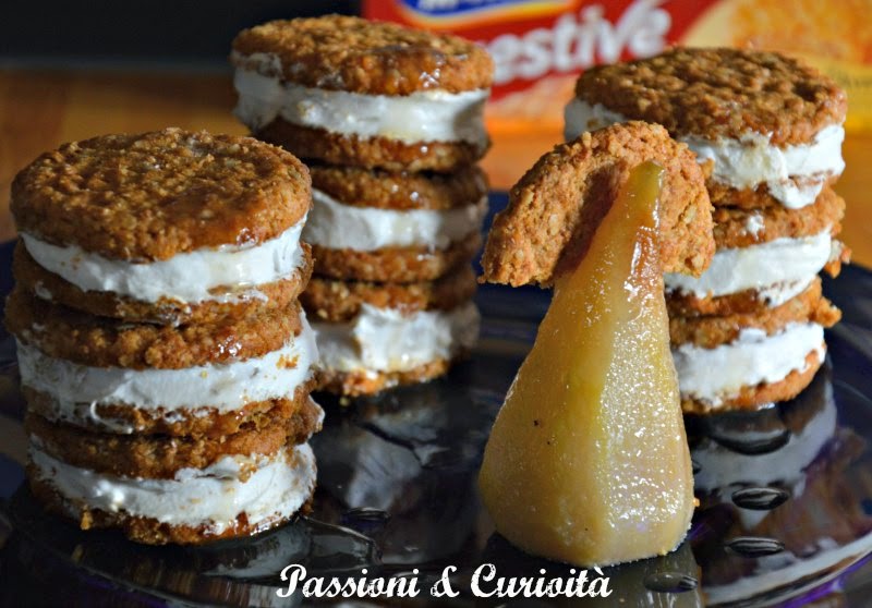 Cominciare a montare la panna, aggiungere lo zucchero a velo, alla fine la ricotta. Intanto in un pentolino antiaderente mettere le due pere, una intera e una a pezzettini, con i tre cucchiai di zucchero e l'acqua, coprire e cuocere per almeno mezz'ora, comunque fare asciugare l'acqua e caramellare le pere.Fare raffreddare i pezzettini e unirli alla crema, mettere in frigo un paio d'ore e poi comporre i dolcetti con i biscotti mcvities digestive.Prima di servire comporre a piacere nel piatto di portata con la pera caramellata.