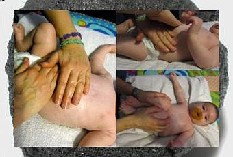 Massaggi: il massaggio ha un doppio effetto benefico. Prima cosa il contatto con le mani rilassa il bambino, e in secondo luogo lo aiuta ad espellere tutta l'aria e quindi i gas intestinali. ecco i tipi di massaggio da fare: movimenti circolari attorno all'ombelico, quasi come volessimo tracciare una C. Facendo una leggera pressione riusciamo in questo modo a regolare il regolare funzionamento dell'intestino. E' utile eseguire il massaggio con creme ed oli a base di erbe curative o di mandorla. Oppure sdraiando il piccolo sulla schiena, si prendono le gambe e si portano verso l'addome raccogliendole in una pressione leggera. Questo esercizio ripetuto per almeno una decina di volte può terminare con il classico movimento della bicicletta, quindi muovere le gambe simulando una pedalata.