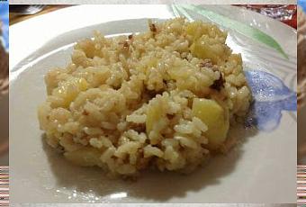 Ingredienti:- Riso parboiled: 450gr;- Salamina tipo carne mista: 1- Patate: 2 media misura;- Gorgonzola 200gr;- Brodo vegetale;- Olio extra vergine;- Sale;- Pepe.