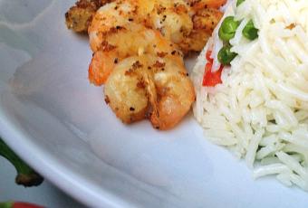 Ho lessato, per prima cosa, il riso in acqua bollente e l’ho saltato in padella per qualche istante insieme ai piselli che ho cotto con un po’ d’olio e un goccio d’acqua. Ho aggiunto il peperoncino tagliato a listarelle sottili e ho lasciato raffreddare. Nel frattempo ho sgusciato il gamberetti sbollentati in acqua bollente per un paio di minuti e li ho panati con pangrattato e semi di papavero. Li ho passati sotto il grill per 5 minuti per farli rosolare bene. Ho aggiustato di sale e pepe. Per concludere ho preparato una salsa con 80 ml di panna di soja alla quale ho aggiunto un cucchiaio di curry. Ho servito il riso con gli spiedini e ho riempito un peperoncino, accuratamente svuotato dai suoi semi, della salsa con la quale poterli condire a proprio piacimento. Il riso si può servire tiepido o freddo, ma gli spiedini e la salsa dovranno essere ben caldi.