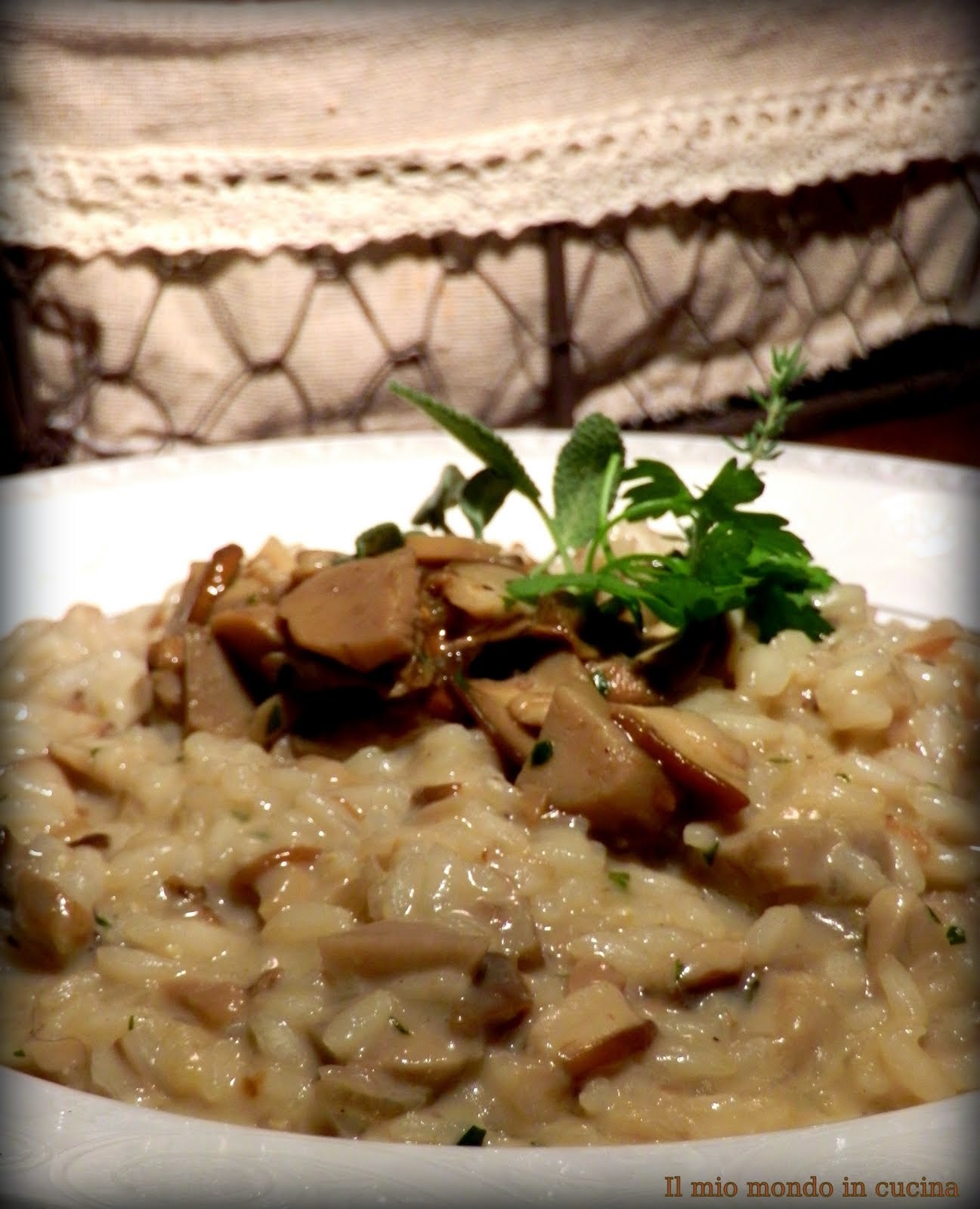 Ingredienti per 2 persone : 180 gr. riso carnaroli – 400 gr. funghi porcini freschi – 10-12 gr. funghi porcini secchi - 1 scalogno grande – aglio - brodo di carne - vino bianco secco – marsala secco - 40 gr. robiola – 20 gr. parmigiano reggiano grattugiato - sale – pepe - timo - salvia – prezzemolo fresco - olio e.v.o. - burro
