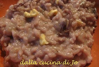 Trito la cipolla e la metto a sudare con un velo d'olio in una casseruola, poi aggiungo il radicchio, sfogliato, lavato e asciugato, e tagliato a listelli sottili. Lo lascio appassire pochi minuti a fiamma vivace poi verso il riso, lo faccio tostare e lo sfumo con il vino rosso. Quando questo è evaporato termino la cottura del riso aggiungendo acqua bollente a mestoli, mano a mano che asciuga.Alla fine regolo il sale e manteco col taleggio a dadini e con i gherigli di noce tritati non troppo finemente.