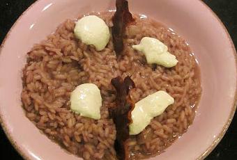 Ho tostato il riso in una casseruola con un fondo di scalogno a fettine, una fetta di speck tagliata a listarelle e olio extravergine di oliva. Ho sfumato con il vino rosso, lasciato evaporare, e bagnato con il brodo per portare il riso a cottura, regolando di sale. A parte ho stemperato il caprino con un goccio di latte, ho aggiunto un pizzico di sale e noce moscata. Ho tostato il restante speck in forno per qualche minuto. Ho servito il riso con le gocce di caprino e lo speck croccante.