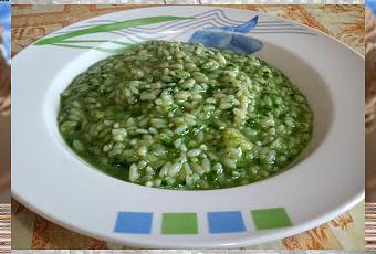 Sbollentate le foglie di spinaci pulite e lasciate intere. Tagliate finemente mezza cipolla piccola e soffriggetela in poco olio di oliva. Aggiungete il riso e mescolate per un minutino. Irrorate con il brodo e continuate a mescolare.