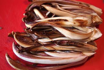 Rosoli la cipolla col bacon tagliato a cubetti e poi versi il riso. Le solite cose, quando è tostato ci metti il vino scaldato col microonde, aspetti che vada via l'odore alcoolico e lo porti a cottura con il brodo. Nel frattempo metti sulla griglia due cespi di trevigiana tardiva e la fai appassire e nel padellino piccolo metti una manciata di chicchi di sesamo.