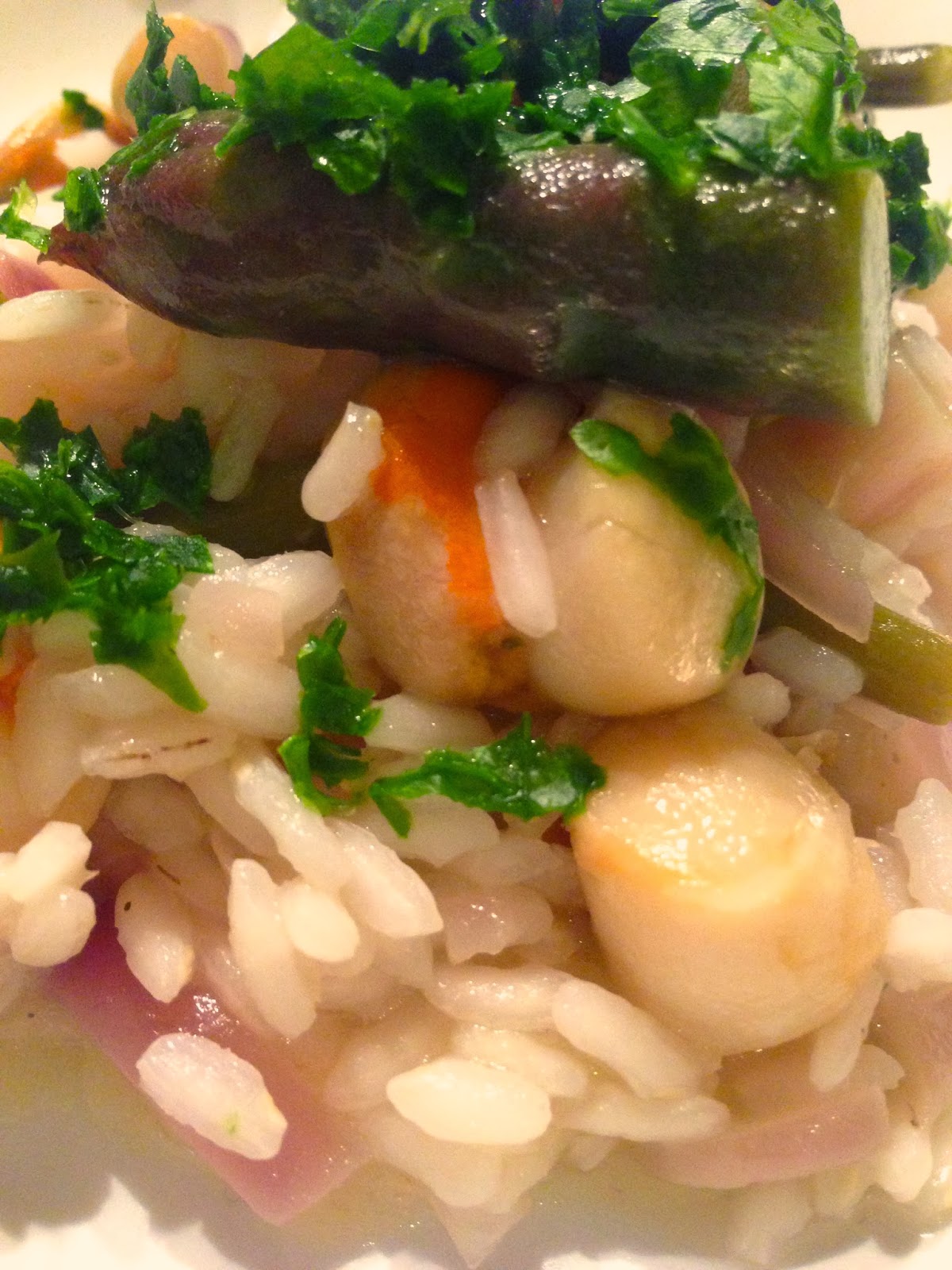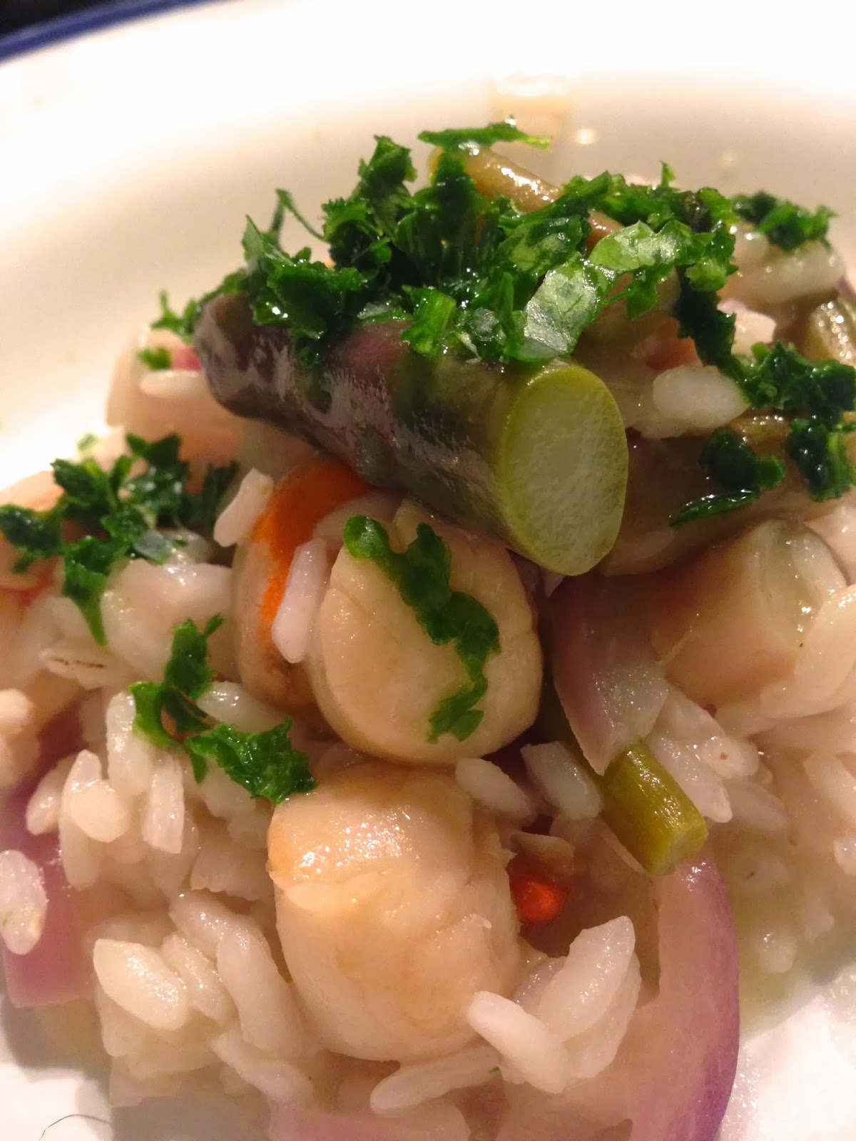 Ho pensato subito alla cena e nel mio ricettario mentale 2.0 è uscito un piatto davvero gustoso dai colori sfavillanti: risotto con asparagi e capesante.
