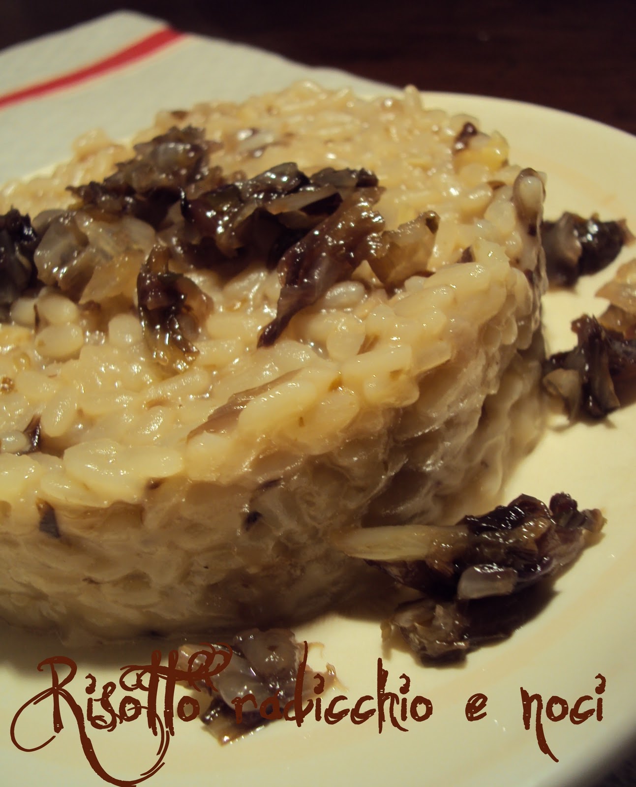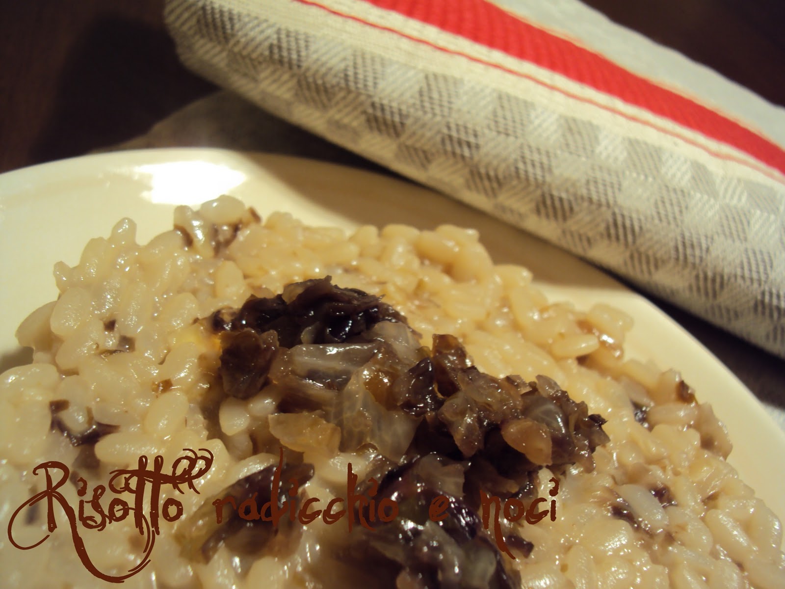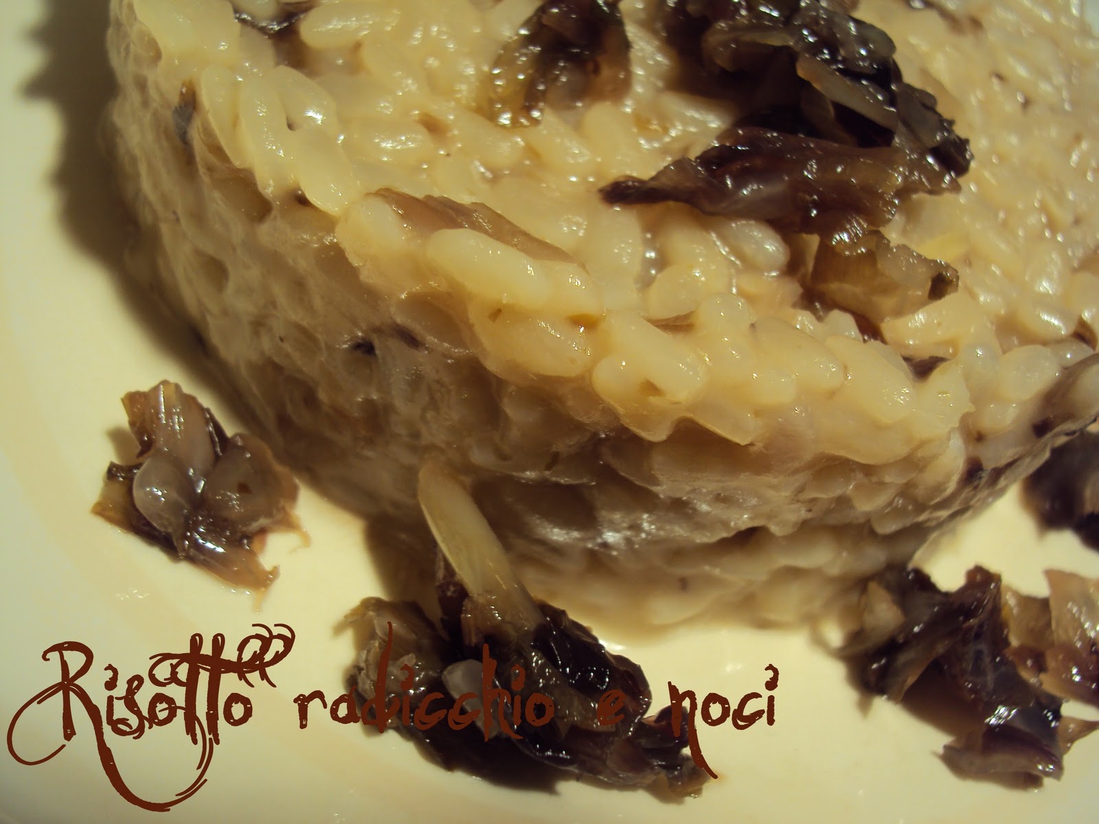 300 gr di riso 5 cucchiai di olio di oliva una cipolla media un cespo di radicchio rosso 50 gr di noci 1 l di brodo vegetale qui parmigiano o gruyère sale q.b.