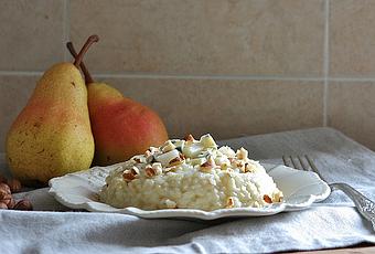 Nel frattempo tagliate a dadini le pere e il Lou Blau. Poco prima che il risotto termini la sua cottura, aggiungete un ultimo piccolo mestolo di brodo, il Lou Blau e le pere (tenete da parte qualche dadino per la decorazione finale) e mescolate bene.