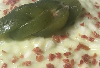 Riscaldare il riso a diretto contatto con la pentola in cui verrà cotto il risotto. Meglio una pentola in acciaio, con fondo spesso che garantisce continuità di temperatura, riducendo gli sbalzi termici. Il calore deve essere medio-alto, evitando però di bruciare il riso. Procedere con la cottura del riso mescolando di frequente e aggiungendo il brodo caldo poco alla volta. Raggiunta la cottura allontanare dal fornello e unire la crema di robiola e mini kiwi mantecando perfettamente, incoperchiare e lasciar riposare il risotto per qualche minuto. Servire a specchio nei piatti guarnendo con un Nergi® a fettine e le briciole saporite di prosciutto crudo.