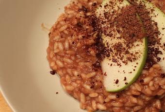 Sbucciare la mela, eliminare il torsolo e tagliarla a cubetti.In una casseruola, fare imbiondire la cipolla tritata grossolanamente in un filo d'olio extravergine d'oliva. Eliminare la cipolla e aggiungere il riso. Farlo tostare leggermente, sfumare con mezzo bicchiere di vino e lasciarlo evaporare. Aggiungere la mela, bagnare con il brodo bollente e portare a cottura aggiungendo altro brodo ogni volta che si asciuga.Al termine della cottura, spegnere la fiamma, incorporare il cioccolato, il burro e il parmigiano e mantecare energicamente. Lasciare riposare due minuti e servire.