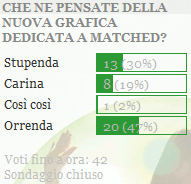 Buonasera a tutti! Scaduto ormai da qualche giorno, vi posto il risultato del secondo sondaggio del blog che parlava della grafica dedicata a Matched. La domanda era... Che ne pensate della nuova grafica dedicata a Matched? La vostra risposta generale è.. Orrenda Quindi, a fino maggio la grafica cambierà radicalmente.. sto già pensando ad una tutta nuova ;)