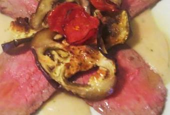Un secondo di carne adatto alla stagione primaverile, con crema di cannellini e sottili rondelle di melanzane al forno. Una ricetta parca di condimenti ma gustosa e saporita.