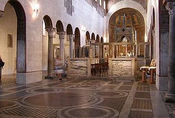 All'interno della Basilica sono conservate, ancora al loro posto, dieci colonne di marmo con capitelli corinzi, appartenuti proprio alla Statio Annonae: sette di queste colonne, erano in "facciata", mentre le altre tre (visibili nel muro della navata sinistra) erano collocate molto probabilmente lungo uno dei lati minori. La chiesa nell'VIII secolo fu destinata ai monaci bizantini che, fuggiti alle persecuzioni degli iconoclasti d'Oriente durante la controversia religiosa sul culto delle immagini, si erano stabiliti proprio nei pressi del Tevere.
