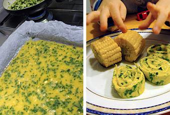 Arrotolare la frittata e lasciarla arrotolata nella carta da forno fino a quando non si sarà raffreddata un pochino.