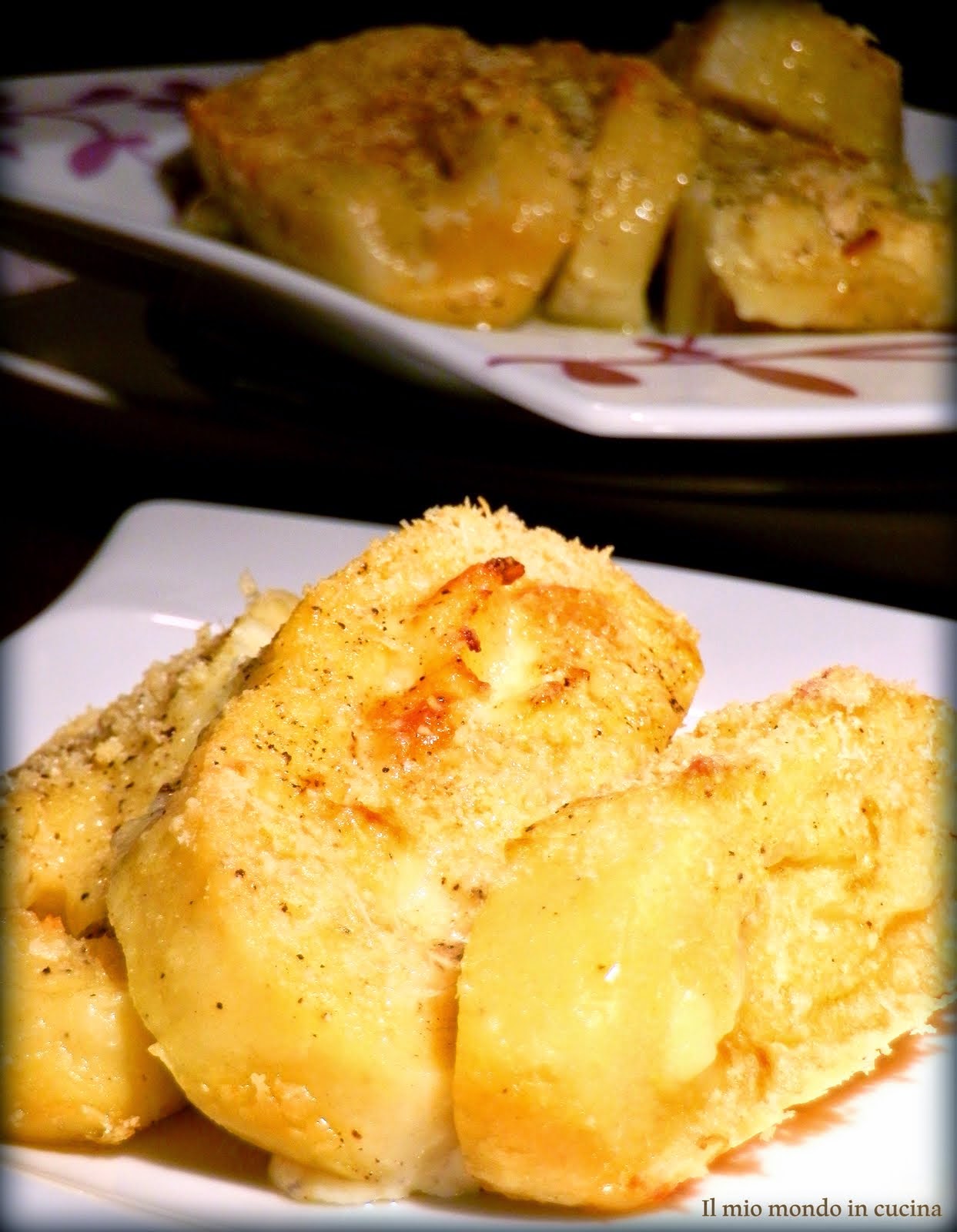 Imburrare una teglia e disporvi le fette leggermente accavallate. Condire con metà burro sciolto e aromatizzato con la salvia, parmigiano grattugiato e pepe macinato.
