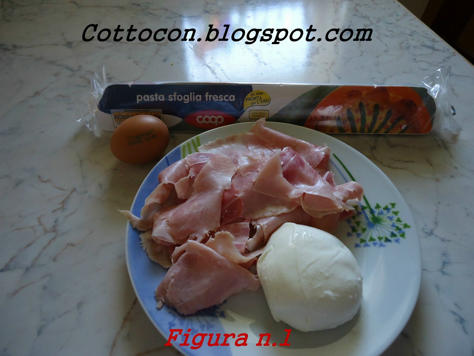 Aprire la pasta sfoglia fresca e metterci sopra i pezzettini di mozzarella,il prosciutto,i funghi e l'uovo sbattuto