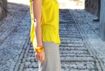 Skirt, custom-made; shoes, Porselli; blouse, Zara; Bag, YSL; bakelite bangles, vintage; necklace, Pomellato; sunglasses, Dior; nail polish, Chanel Peridot.
